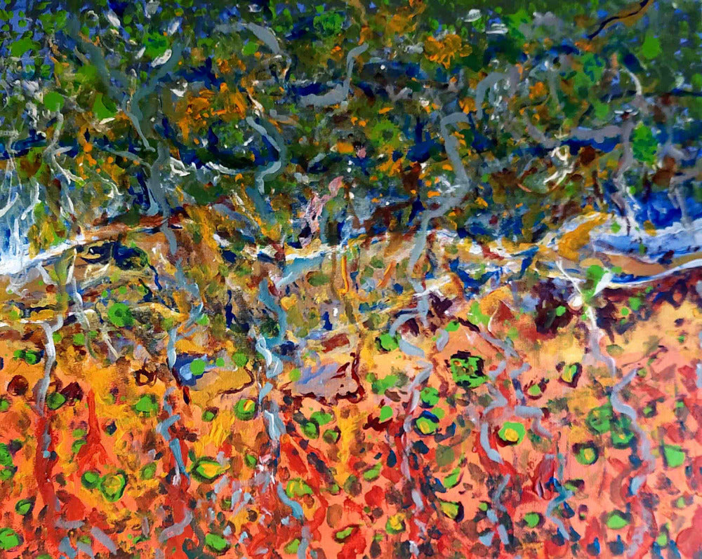 I painted this scenario after watching a program of a man travelling up along the coast of Western Australia and across to the Barkley Tablelands. He camped at a beach along the way and filmed a scene of the tide coming in. The tides in this area are extremely high and it covered a lot of land inwards – completely different to the tame tides on our East Coast. I came up with a semi-abstract which accentuated the colours of that fascinating and remote part of the world.